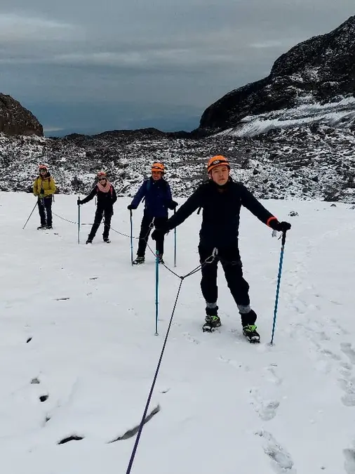 Inicia la parte mas esperada y mas emocionante: el ascenso por la nieve, siguiendo las recomendaciones del guía, avanzamos hasta llegar a la cima norte a 4.965 m.s.n.m, llegaremos cargados de energía y con una sensación de alegría que rejuvenece el cansancio que ha sido la llegada hasta este hermoso paraíso; respiraremos aire puro rodeados de un paisaje bellísimo, disfrutaremos el momento presente con los amigos del viaje. Comemos algo del snack e iniciamos el descenso para regresar al vehículo. Llegando a Santa Rosa paramos para almorzar y finalizamos en la ciudad aprox. 3-4 PM.